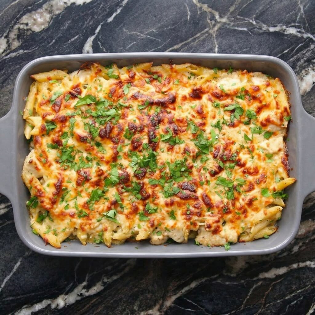 Chicken alfredo bake takes all the creamy, garlicky goodness of classic fettuccine alfredo and transforms it into the ultimate comfort food casserole. Tender chicken, pasta, and a rich, homemade alfredo sauce are baked together until bubbly, then topped with a generous blanket of melted mozzarella and Parmesan.