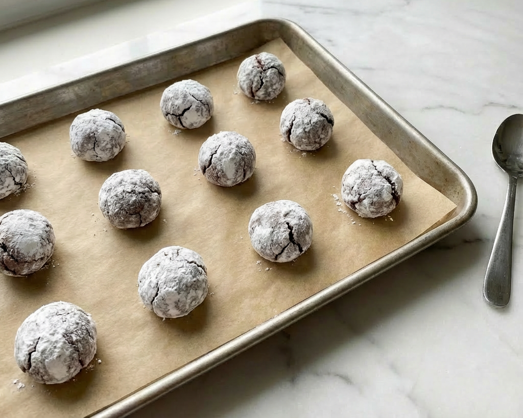Bake at 350°F (175°C) for 10-12 minutes. The cookies will have spread, puffed, and developed dramatic, brown crackles across the white powdered sugar surface. The centers will look soft.