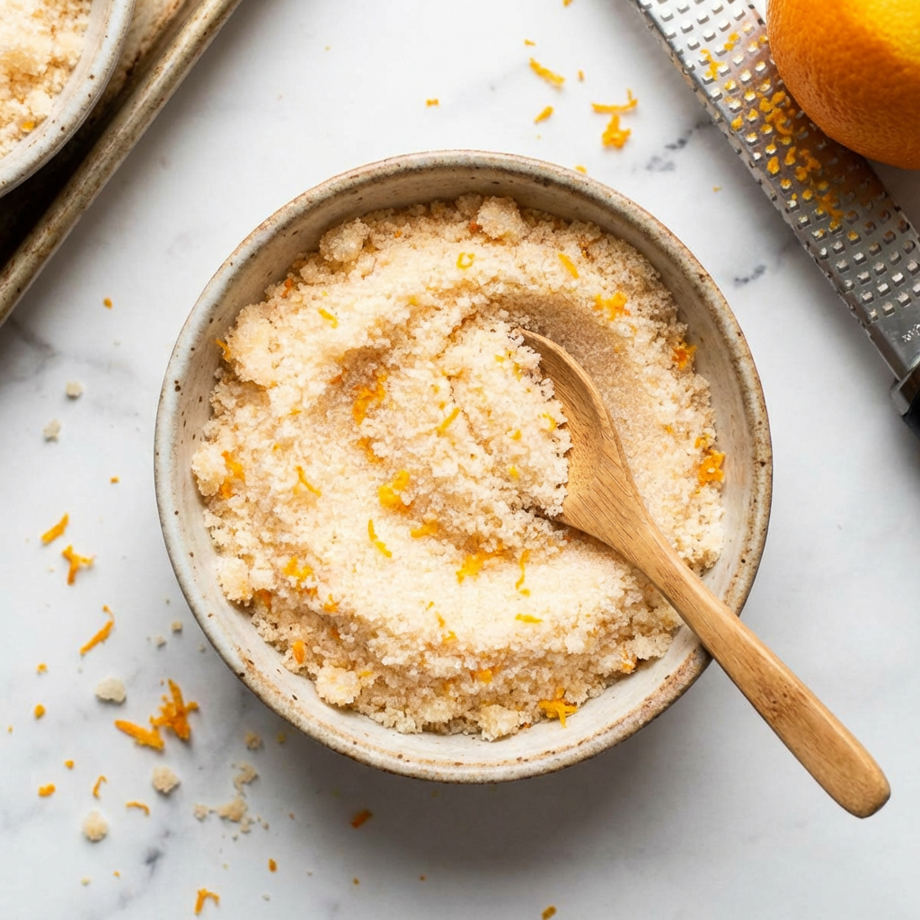 In a small bowl, combine the granulated sugar and orange zest. Use your fingertips to rub the zest into the sugar for a full minute until the sugar is fragrant, moist, and pale orange in color.