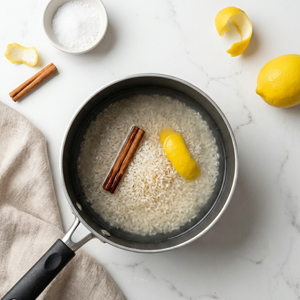 In a large, heavy-bottomed pot or Dutch oven, combine the drained rice, milk, 2 cups of water, the cinnamon stick, lemon zest strips, and a pinch of salt. Bring to a gentle simmer over medium heat, stirring occasionally.