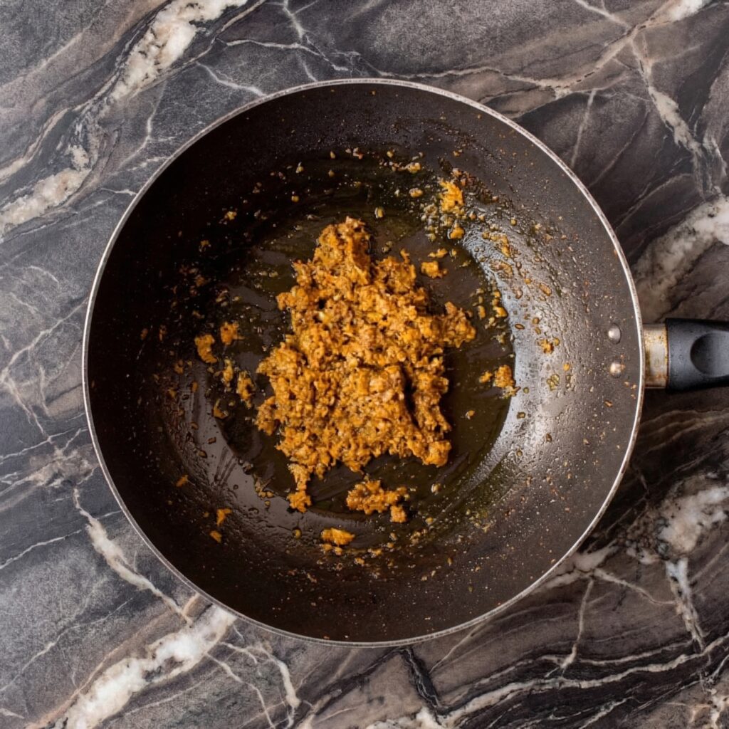 Add the minced garlic and grated ginger. Stir constantly for about 30 seconds, just until fragrant. Be careful not to let the garlic brown—it can turn bitter quickly.