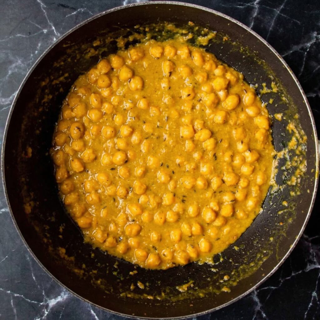 Pour in the drained chickpeas and stir well to coat them in the spiced mixture. Let them cook for 2–3 minutes so they absorb flavor.