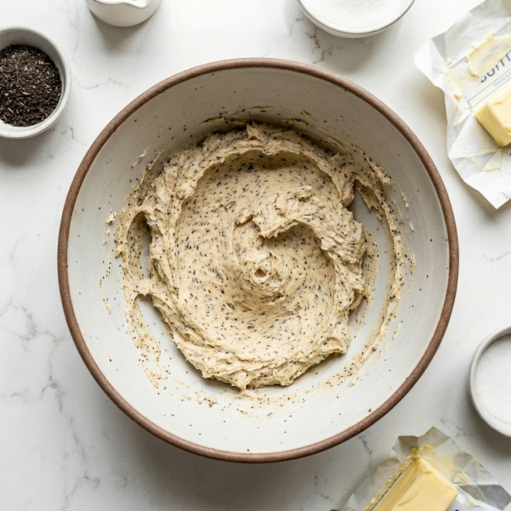 The creaming method is crucial here: beating room-temperature butter and sugar until pale and fluffy incorporates air, which gives the dense pound cake its signature fine texture. The ground tea is blended into the butter-sugar mixture, allowing the fats to fully absorb the aromatic compounds.