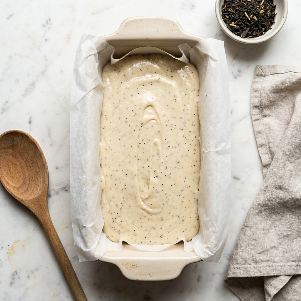 Preheat oven to 325°F (165°C). Grease and flour a 9×5 inch loaf pan, or line with parchment paper. Using a spice grinder or mortar and pestle, grind the loose-leaf Earl Grey tea into a fine powder. In a medium bowl, whisk together the flour, baking powder, salt, and the ground tea until thoroughly combined.