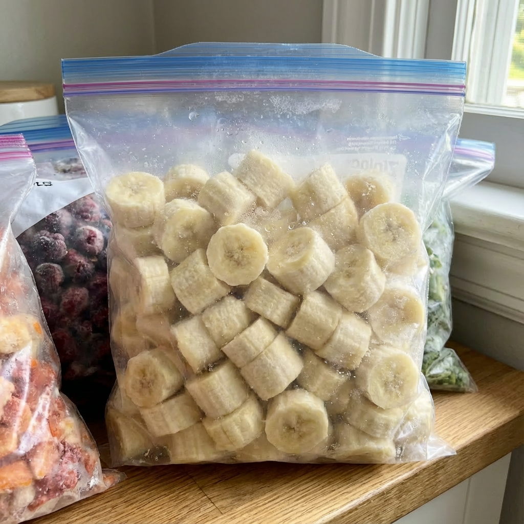 Peel and slice ripe bananas into 1-inch chunks. Arrange in a single layer on a parchment-lined baking sheet or plate. Freeze until completely solid, at least 6 hours or overnight. Store in a freezer bag once frozen.
