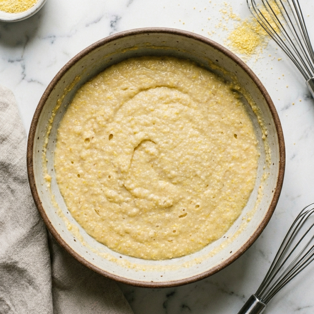Cover and let the mixture rest for 10-15 minutes to allow the cornmeal to fully absorb the water. After resting, stir again. If the batter is too thick to drop from a spoon, add more boiling water, 1 tablespoon at a time, until it reaches a thick but pourable consistency.