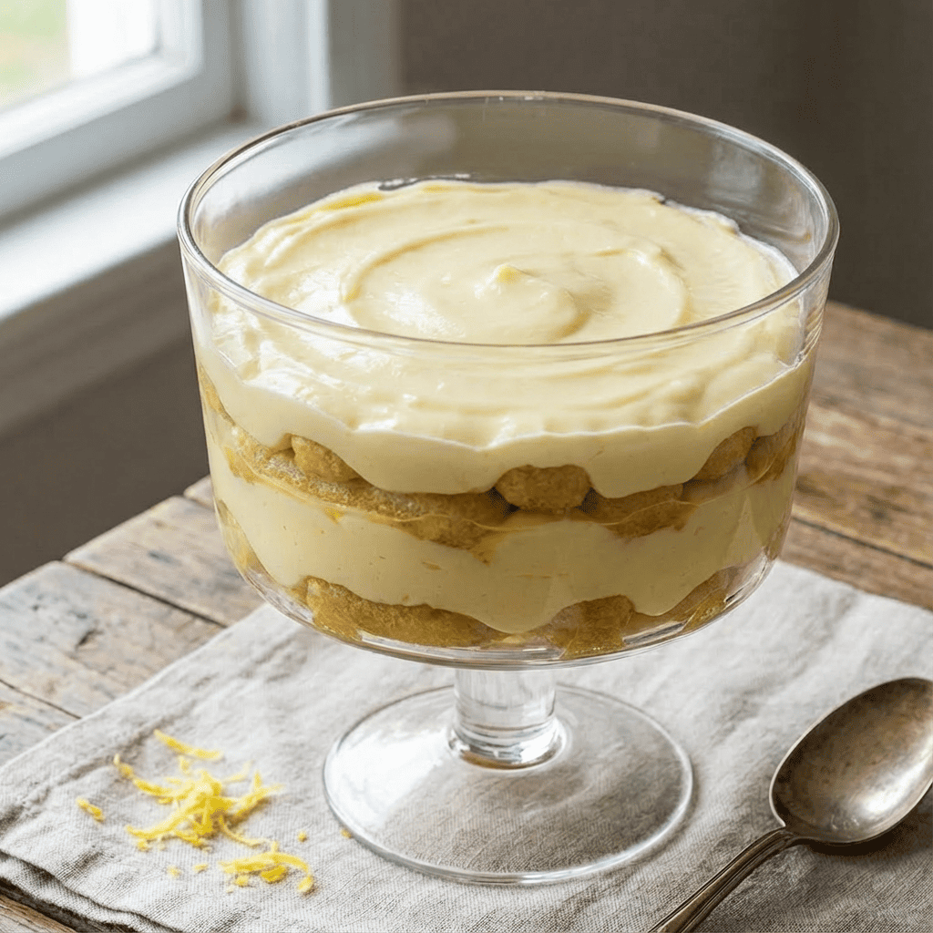 Quickly dip each ladyfinger into the cooled lemon syrup (do not soak—just a 1-2 second dip per side). Arrange a layer in the bottom of an 8×8 dish or a trifle bowl. Spread half of the lemon mascarpone cream over the ladyfingers. Repeat with a second layer of dipped ladyfingers and the remaining cream.