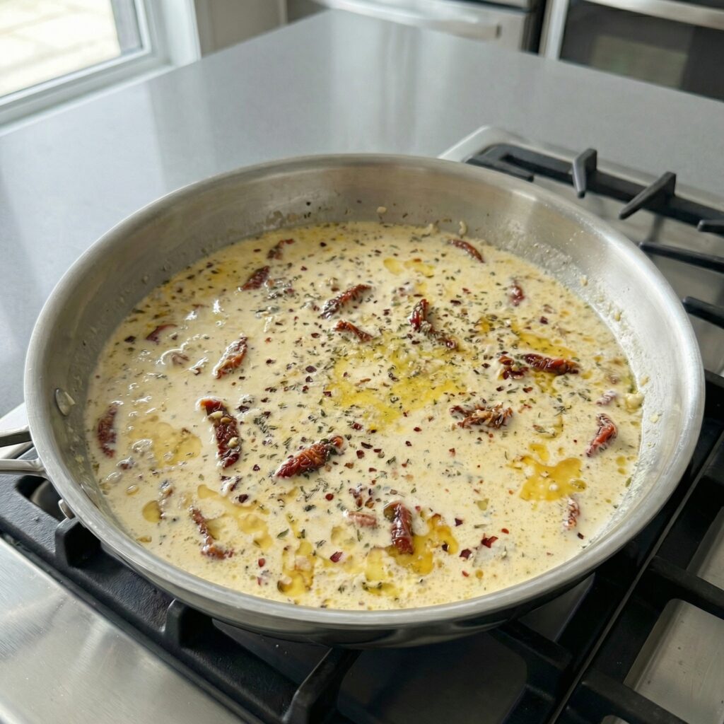 Stir in the heavy cream, sun-dried tomatoes, Parmesan cheese, and red pepper flakes. Simmer for 3–5 minutes, stirring occasionally, until the sauce thickens slightly.