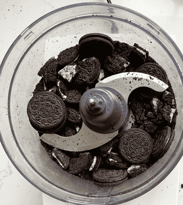 Place the entire package of Oreos (creme filling and all) into a food processor. Pulse until you have a fine, uniform crumb with no large chunks. For a no-mess option, place cookies in a large zip-top bag and crush finely with a rolling pin.