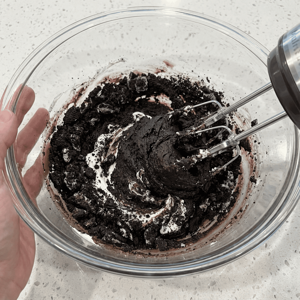 In a large mixing bowl, combine the entire bowl of Oreo crumbs with the softened cream cheese. Use a hand mixer (or a sturdy spoon) to mix until completely combined and a thick, uniform, black “dough” forms. It should hold together when pinched.
