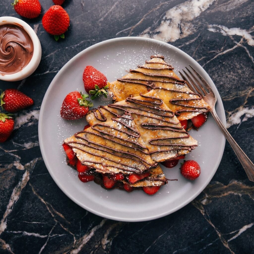 Nutella crepes are the ultimate indulgence—delicate, paper-thin French crepes filled with warm, melted Nutella, folded into triangles, and topped with fresh strawberries and a dusting of powdered sugar.