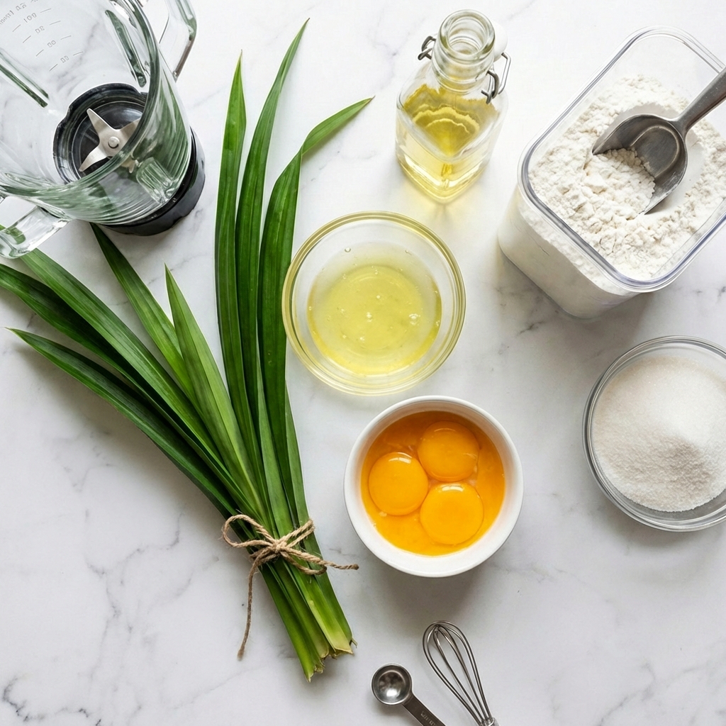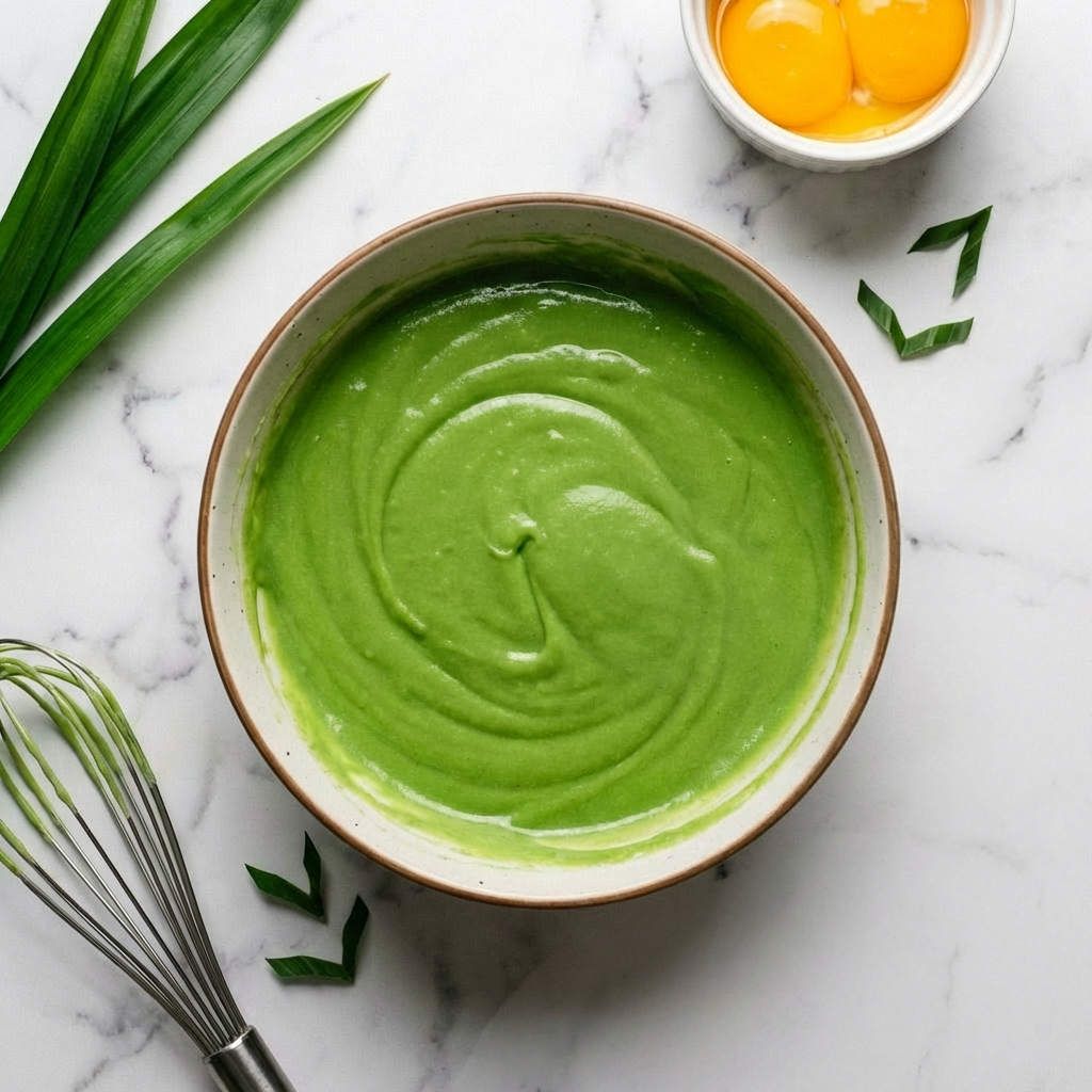 Preheat oven to 325°F (165°C). Do not grease the tube pan. Blend the fresh pandan leaves with water until pulverized. Strain through a fine-mesh sieve or cheesecloth, squeezing to extract as much juice as possible. You should have about ¾ cup. Set aside.