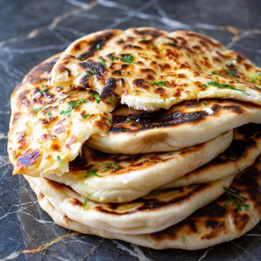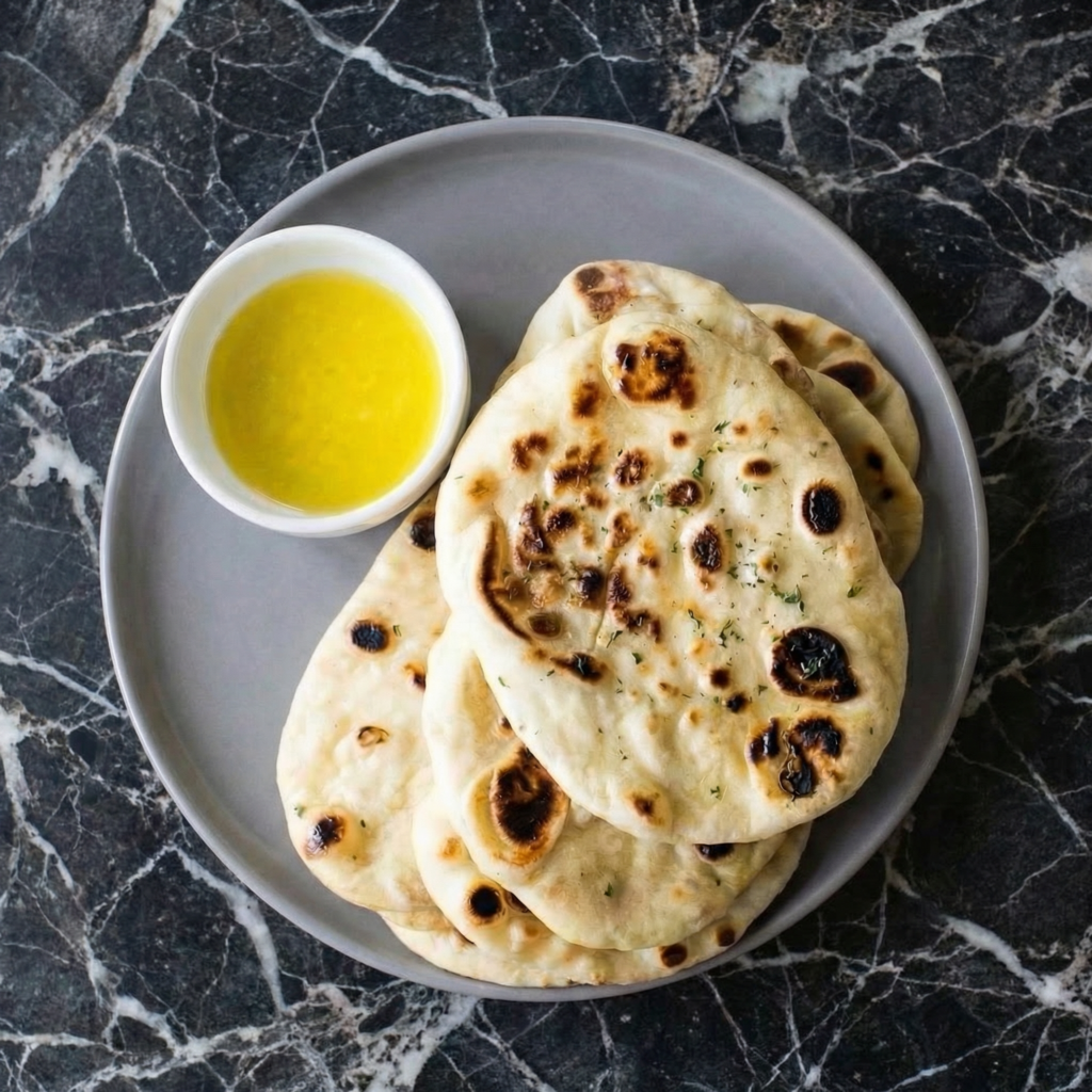 Naan is the quintessential Indian flatbread—soft, pillowy, and perfect for sopping up every last bit of curry, dal, or tikka masala. With its characteristic blisters from a hot tandoor oven, it’s irresistible when brushed with garlic butter and sprinkled with fresh cilantro.