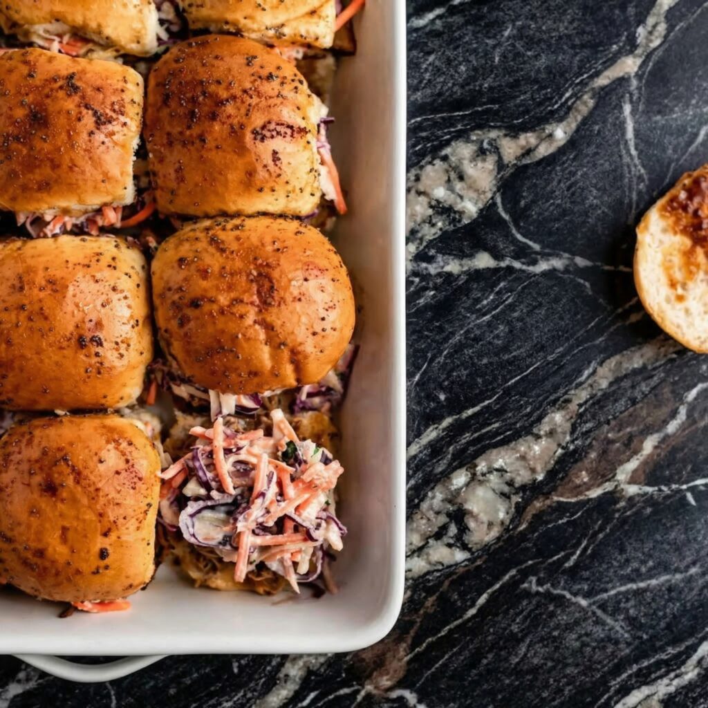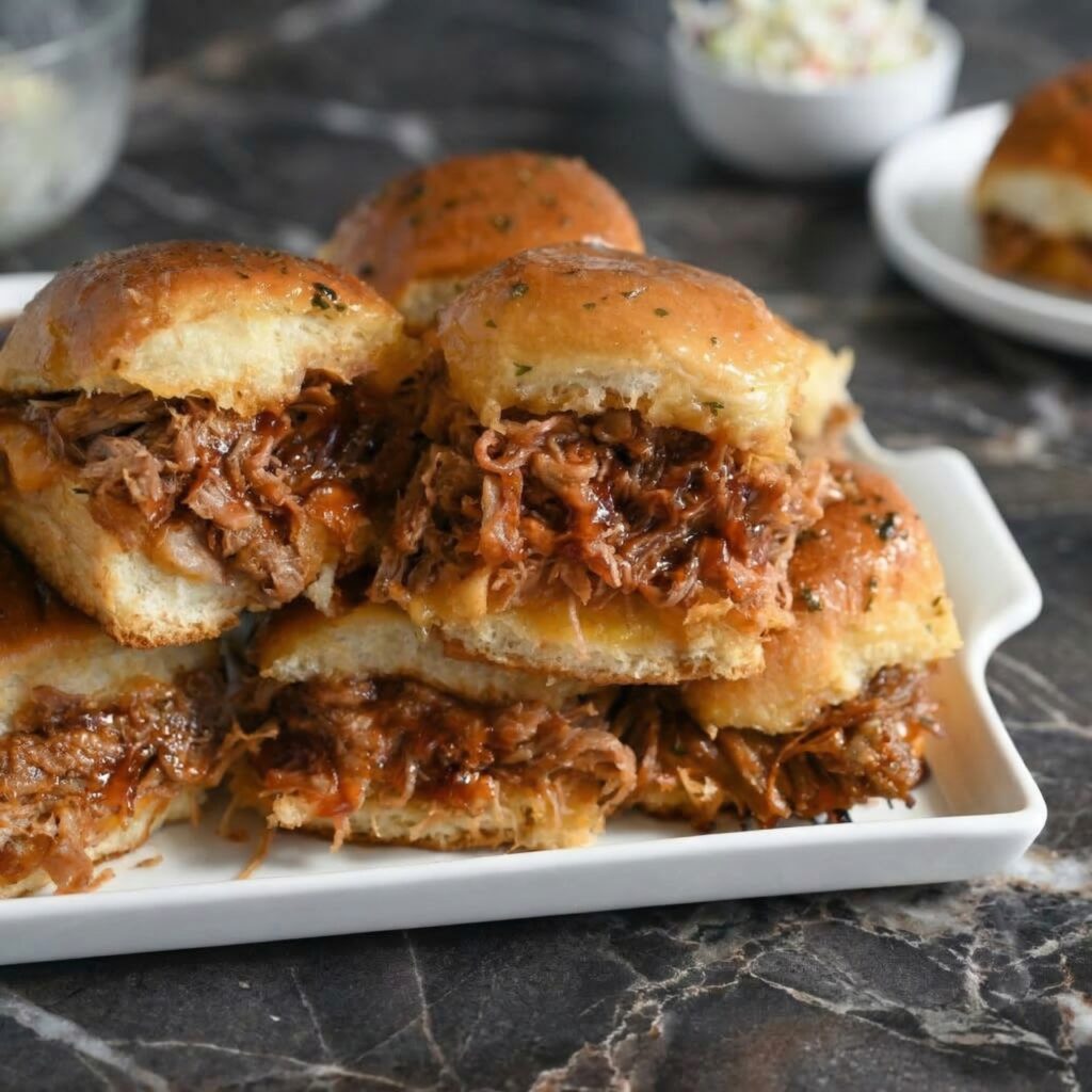 Pulled pork sliders are the ultimate party food—tender, slow-cooked pork piled onto soft slider buns and topped with tangy coleslaw.