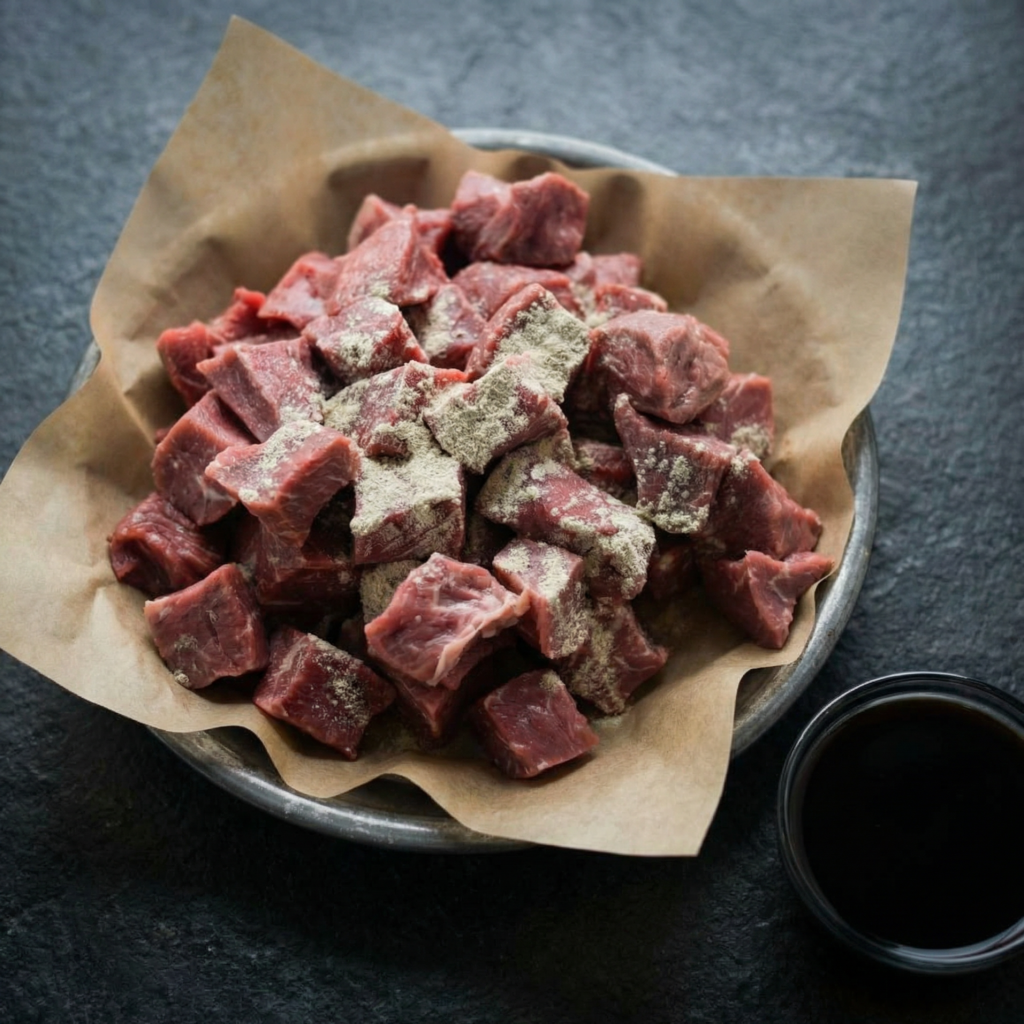 Start by trimming any excess fat from the steak. Cut it into evenly sized cubes—about 1 ½ inches each. Uniform pieces ensure even cooking.